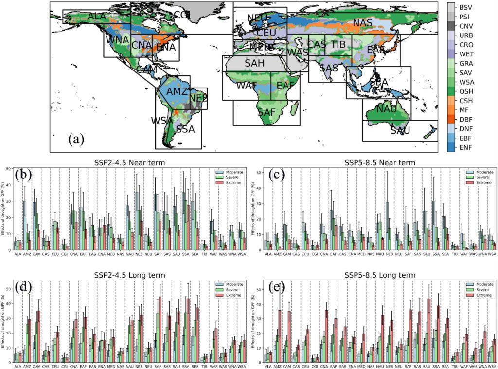 图2. 全球不同区域在未来气候情景下(SSP2-4.5和SSP5-8.5)干旱对GPP影响的空间分布。图a中展示了由IPCC报告(SREX)中定义的全球区域划分,并使用国际地球生物圈计划(IGBP)对全球植被类型进行分类。上图b, d显示了在SSP2-4.5气候情景下2041–2070年和2071–2100年干旱对GPP影响的百分比变化。不同区域的GPP下降幅度不同,图中以百分比形式呈现出各区域因轻度、中度和极端干旱而造成的生产力影响。图c, e展示了SSP5-8.5情景下的干旱影响。