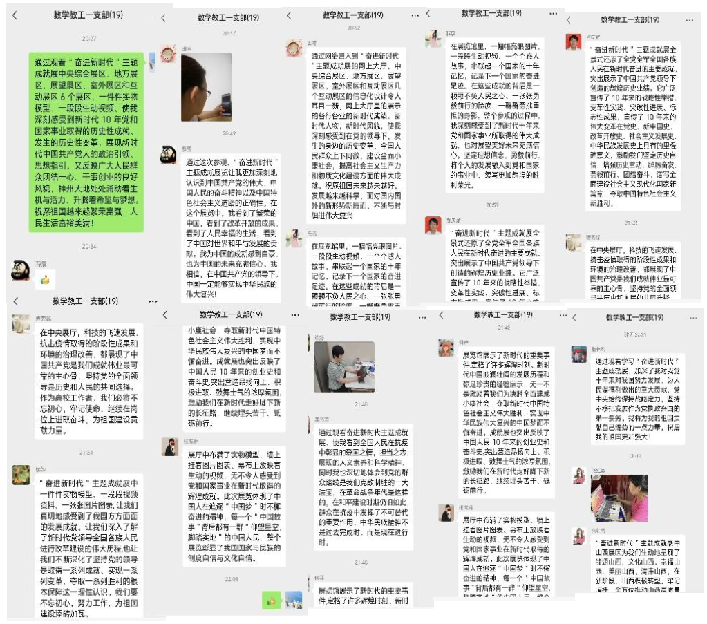 参观结束后,全体党员通过支部微信群纷纷发表了自己的参观心得与体会,大家在感叹山乡巨变、山河锦绣、党的十年非凡成就的同时,纷纷表示作为新时代高校教师,我们要全身心投身教育与科研事业,努力奋进,求实创新,为祖国建设培养更多优秀建设人才,不断向科学技术的广度和深度进军,肩负起时代赋予的科技创新重任,为祖国建设添砖加瓦。