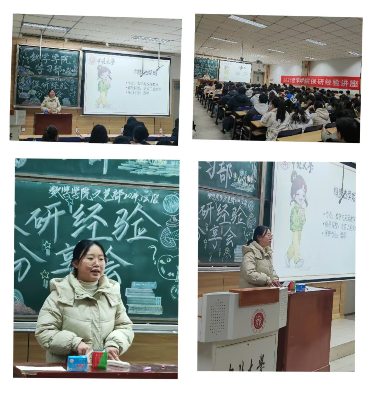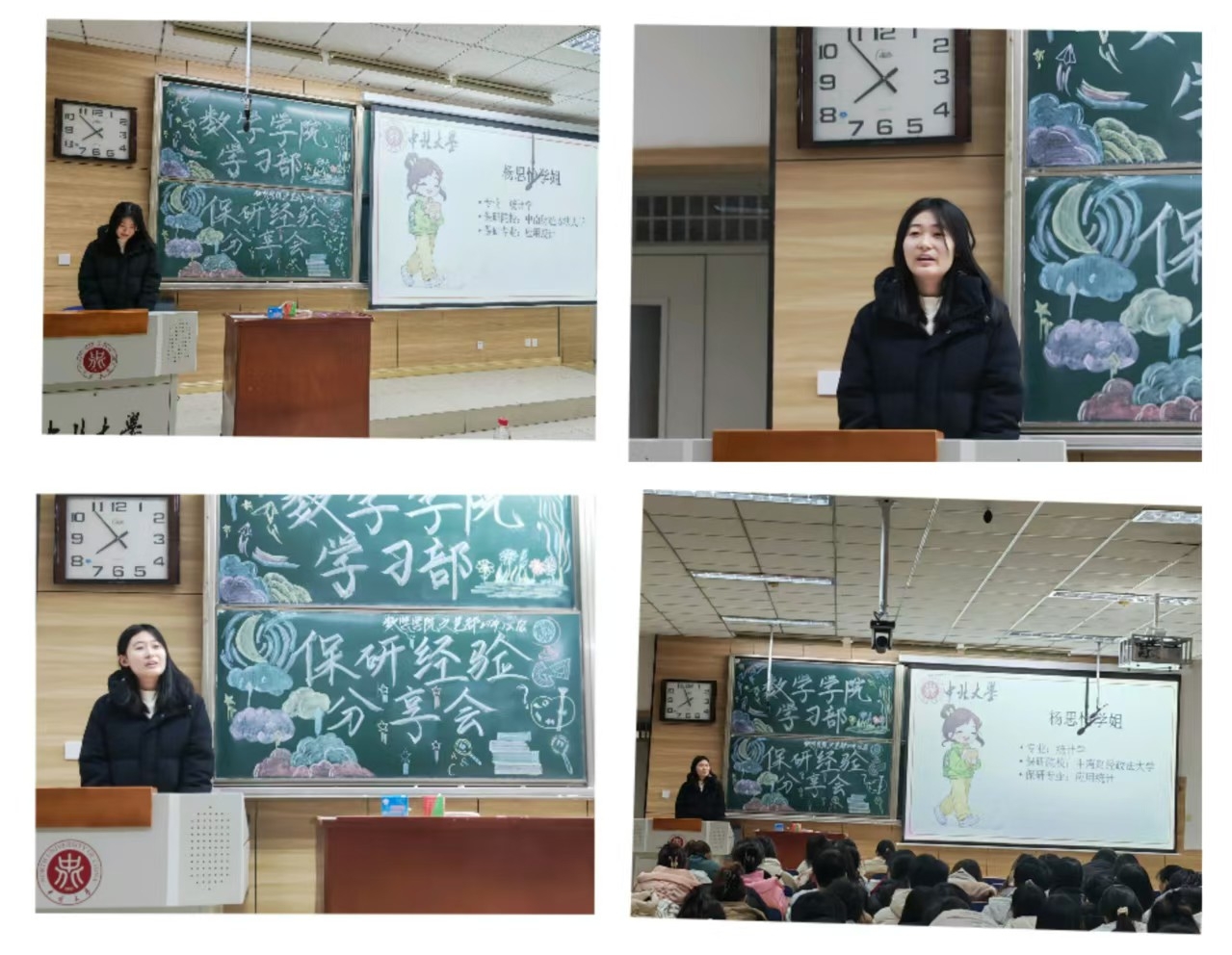 保研经验讲座”活动的事宜, 在12月18日晚上19:30-21:45在教学楼九号楼201展开“保研讲座”活动。本次活动有幸邀请了五位保研学姐进行保研经验分享,她们分别是:闫梦杰学姐,周颖学姐,马凯斌学姐,于潇学姐和杨思怡学姐。本次讲座,学姐们依次上台发言,同学们认真听取学姐们保研经历的相关意见,部门成员并就本次活动进行拍照。