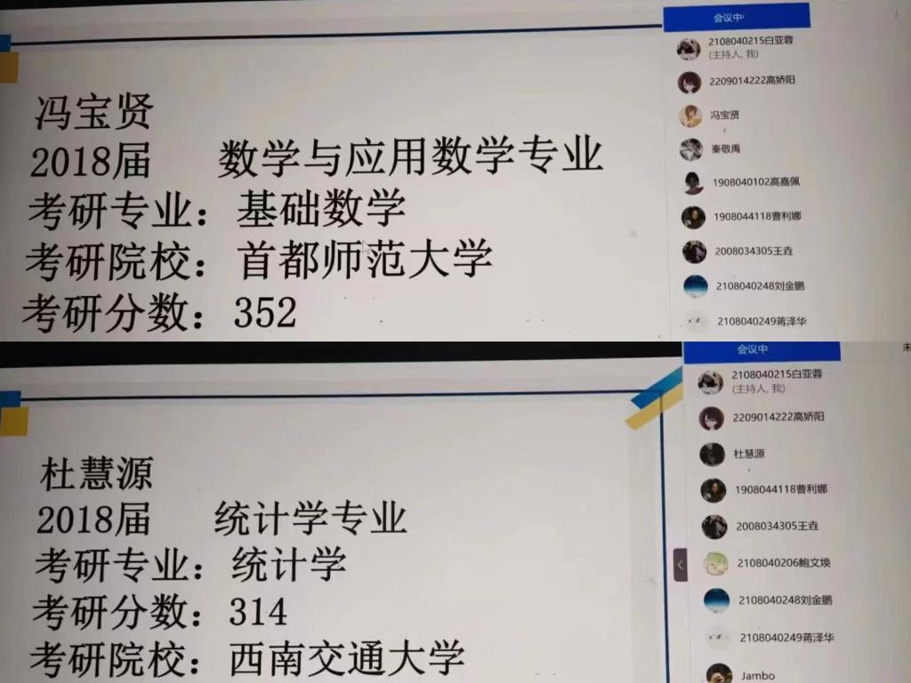 为帮助365足球直播 学生明确考研复试的方向,掌握面试及复试技巧,进一步提高365足球直播 考研学子复试通过率,3月17日,365足球直播 召开考研面试经验分享会,邀请了学院2018级顺利上岸的杜慧源,冯宝贤两位同学分享经验,学院2019级、2020级学生参加了会议。