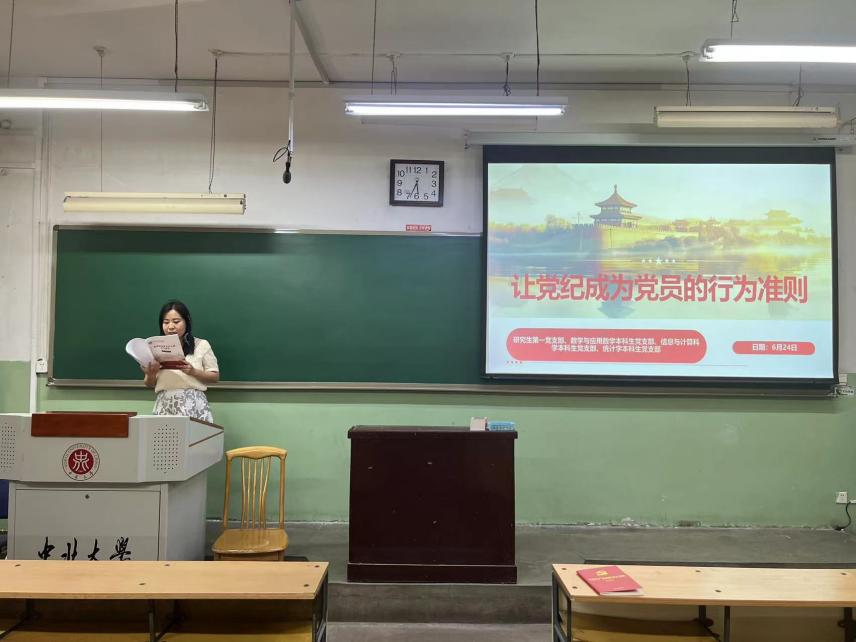 为进一步加强党员纪律教育,提高党员党性修养,6月24日,研究生第一党支部、数学与应用数学本科生党支部、信息与计算科学本科生党支部、统计学本科生党支部,开展“学《条例》 守党纪,让党纪成为党员的行为准则”主题党日活动。